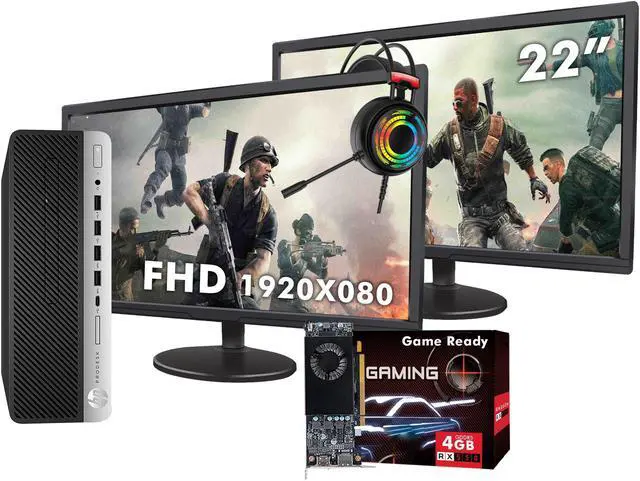 : HP ProDesk 600 G3 SFF Gaming Desktop PC, New Dual 22-inch Full HD Monitor, New Gaming Keyboard & Mouse, New Gaming Headset, Power Cord and Wi-Fi Adapter.
