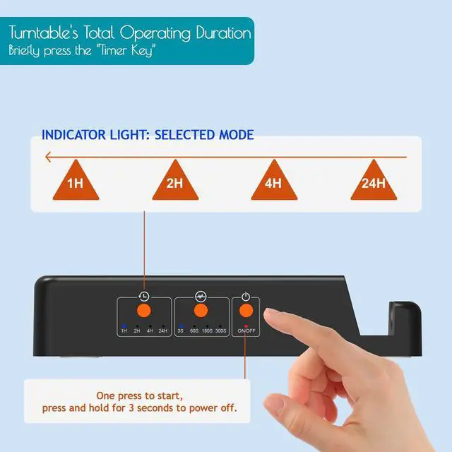 [With Operating Time Switch] Short-press the operating time button to select the turntable's continuous operating time (the corresponding indicator light will light up: 1H, 2H, 4H, 24H).