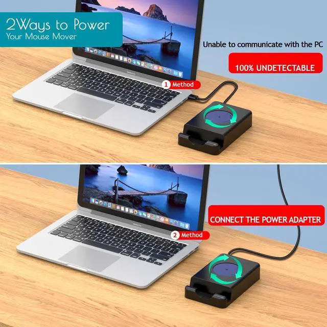 [Completely Undetectable] Mouse Jigger can be powered by an external power adapter or your PC's USB port. No software installation, keyloggers, programs, or Bluetooth are required. It simulates physical mouse movements and is undetectable by hardware scans or corporate IT.