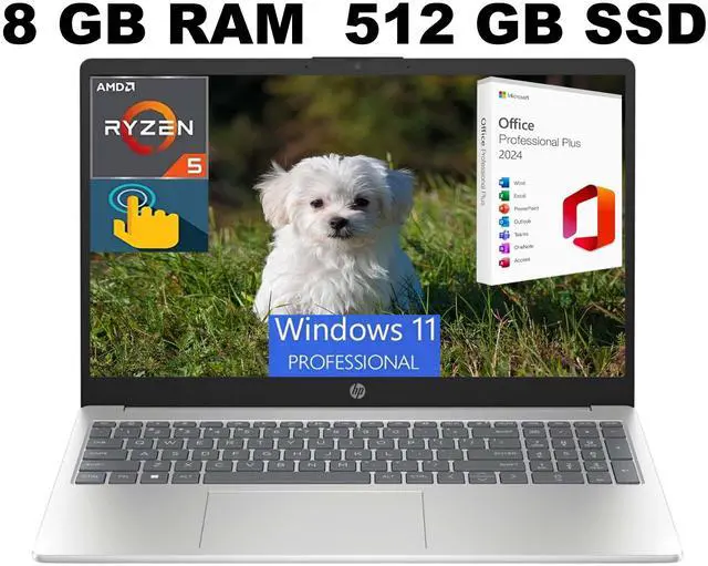 HP 15 Laptop, 15.6" HD (1366 x 768) Touchscreen, AMD Ryzen 5 7520U 4 Cores Processor, AMD Radeon Graphics, 8GB DDR4 512GB PCIe SSD, Bluetooth, Wi-Fi, Windows 11 Pro ,Office 2024 License