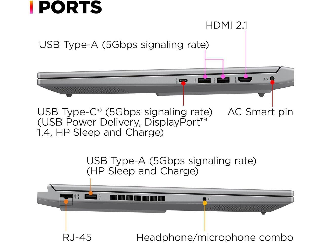 - Ports : 1 x USB Type-C 5Gbps signaling rate (USB Power Delivery, DisplayPort 1.4, HP Sleep and Charge), 3 x USB Type-A 5Gbps signaling rate, 1 x AC smart pin, 1 x HDMI-out 2.1, 1 x headphone/microphone combo