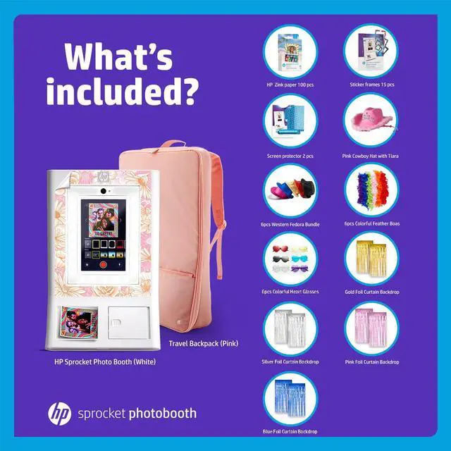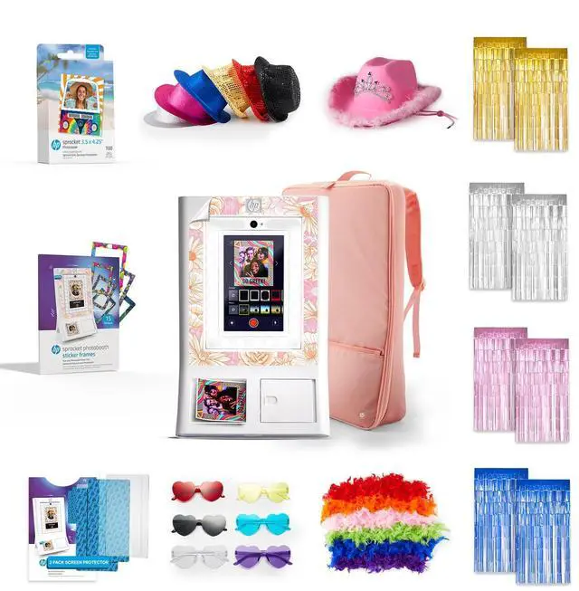 HP Sprocket Photo Booth Machine Instant Color Photo Printer (White)+ Paper (x100)+ Case + Frames (x15)+ Screen Protector (x2)+ Fedoras (x6)+ Glasses (6pc)+ Boas (x6)+ Cowboy Hat + Foil Curtain (x5)