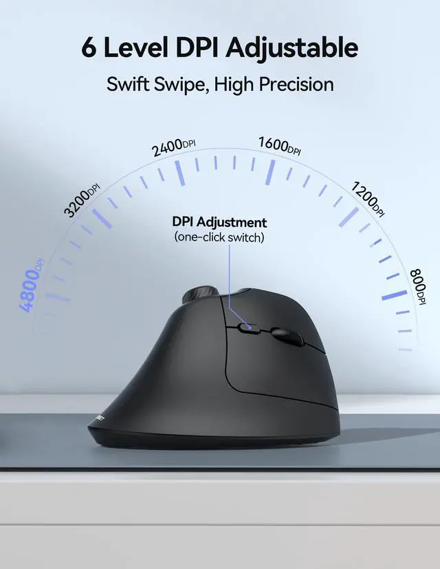 This vertical mouse is equipped with a high-performance chip and features 6 adjustable DPI levels (4800/3200/2400/1600/1200/800) to meet your daily needs.