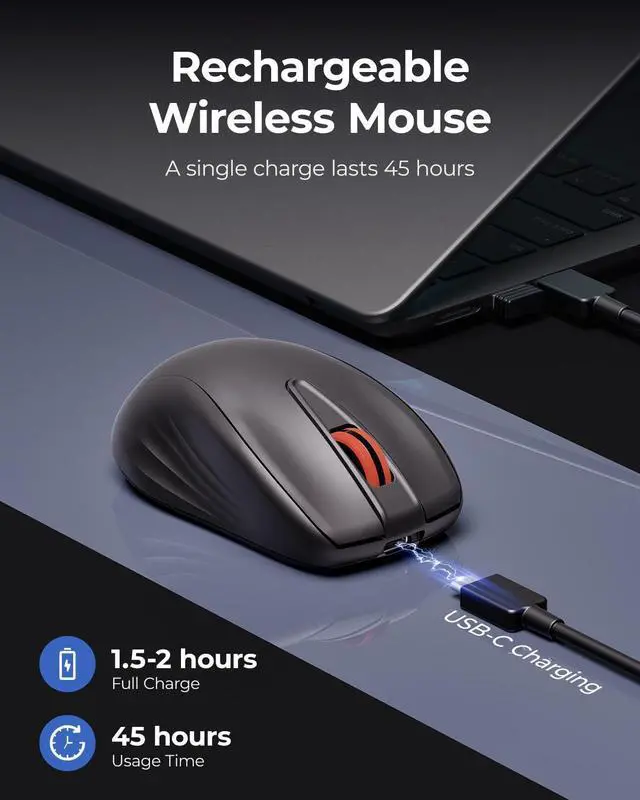 Rechargeable Wireless Mouse Stay productive with a built-in 380mAh lithium battery, offering up to 45 hours of continuous use on a single charge, and a convenient USB-C charging port for easy recharging