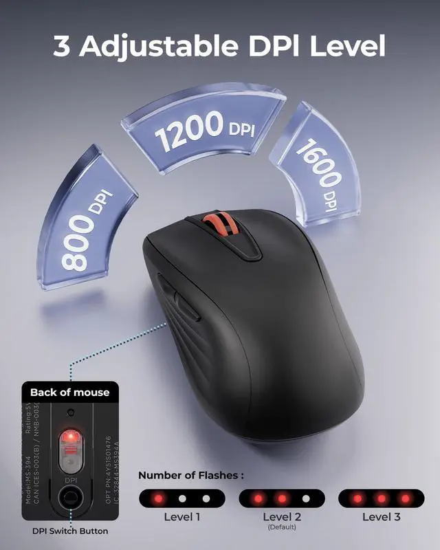 3 Adjustable DPI Levels for Precision With 800 DPI, 1200 DPI, and 1600 DPI optical tracking, this laptop mouse wireless offers three adjustable DPI levels. Switch effortlessly between DPI settings using the button on the computer mouse bottom, ensuring smooth and accurate movement for different tasks, from browsing to detailed work