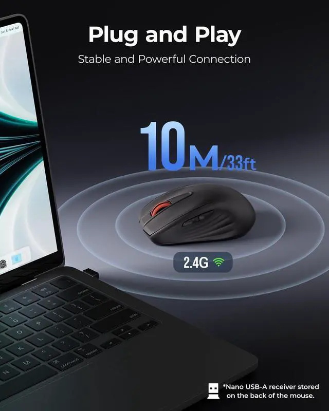 Lag-Free, Plug and Play No drivers required. 2.4GHz wireless technology ensures a stable, powerful connection up to 33ft (10m), minimizing interference and delay (Note: Nano USB-A receiver stored on the back of the mouse)
