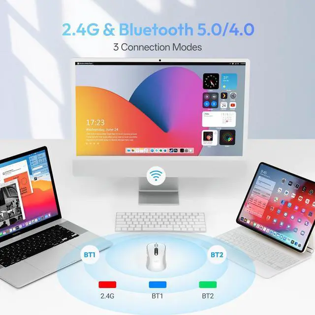 Tri-mode Bluetooth MouseThis mouse connects via Bluetooth 5.0/4.0 or 2.4GHz wireless seamlessly pair this wireless mouse with laptops, tablets, or PCs. Switch between devices in 0.8s, perfect for hybrid office and home setups.