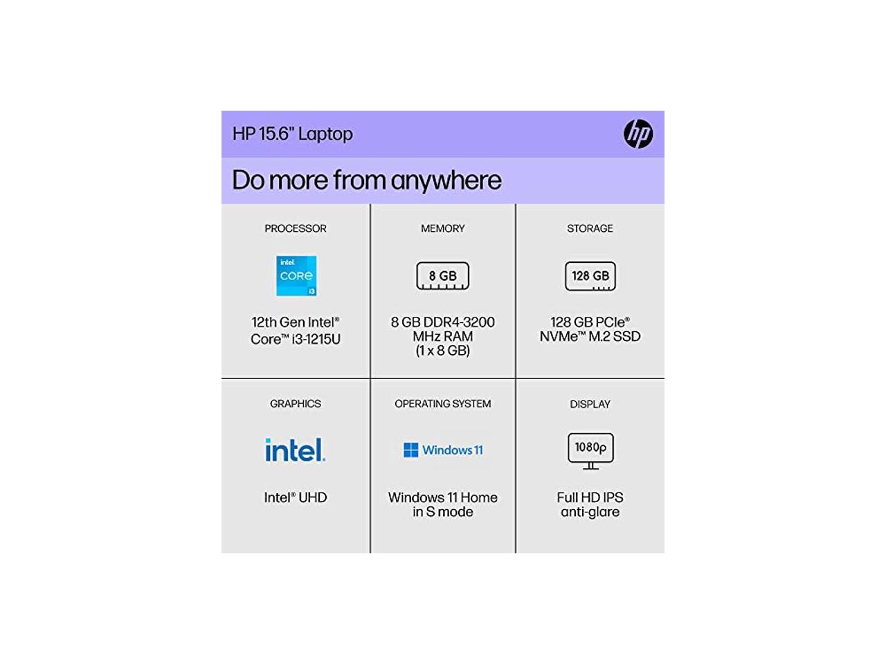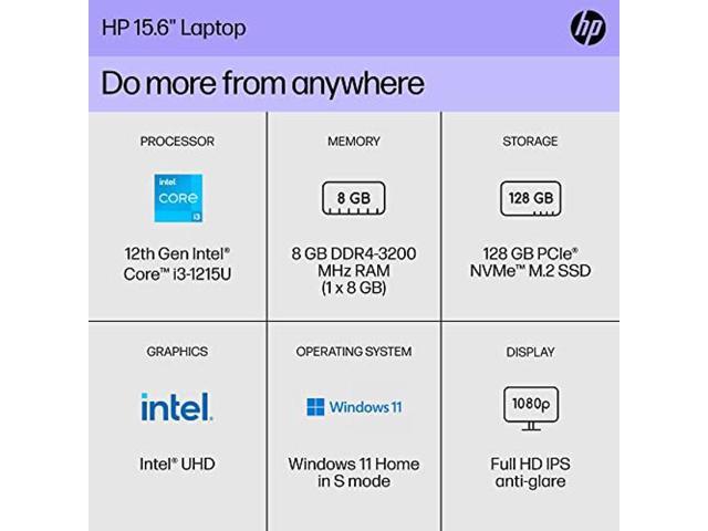 HP 15 inch Laptop, FHD Display, Intel Core i3-1215U, 8 GB RAM, 128 GB SSD, Intel UHD Graphics, Windows 11 Home in S Mode, 15-dy5599nr (2023)