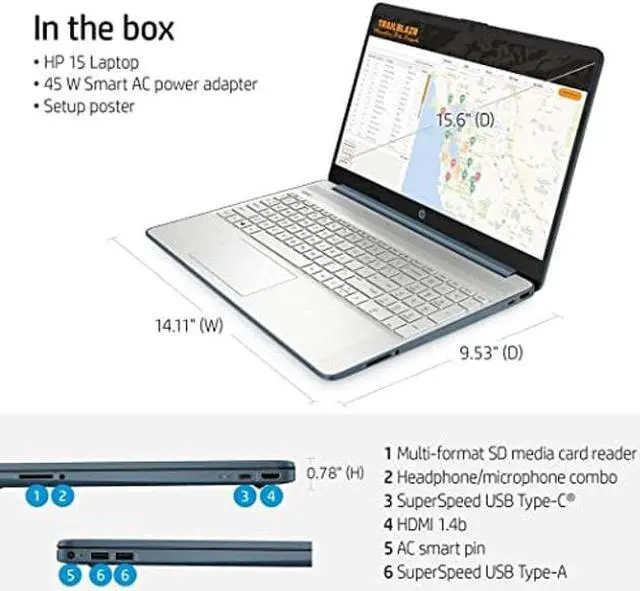 External ports: 1 SuperSpeed USB Type-C 5Gbps signaling rate; 2 SuperSpeed USB Type-A 5Gbps signaling rate; 1 HDMI 1.4 b; 1 AC smart pin; 1 headphone/microphone combo