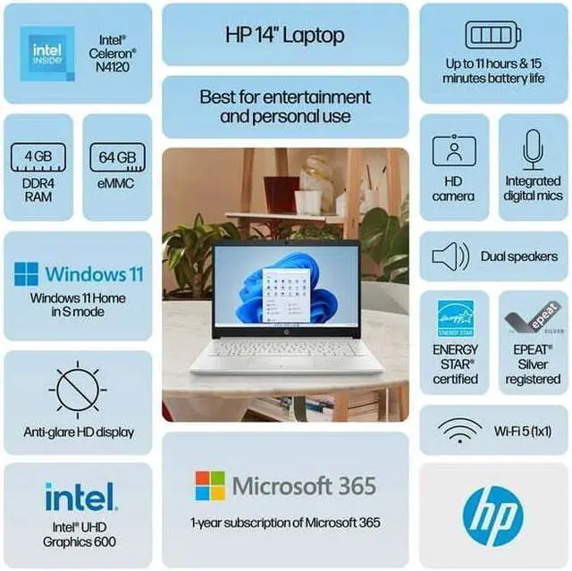 HP Laptop 14" HD Intel Celeron N4120 4GB 64GB eMMC Webcam Office 365 Silver
