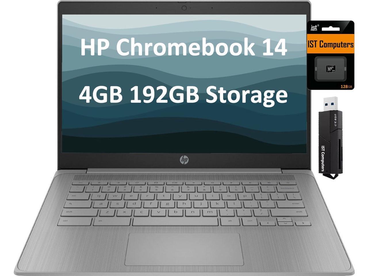 HP Chromebook 14a 14" HD (Intel Celeron N4120, 4GB RAM, 192GB Storage (64GB eMMC + 128GB IST SD Card)) Home & Student Laptop, Long Battery Life, SD Card Reader, Webcam, Wi-Fi, Type-C, Chrome OS, Grey