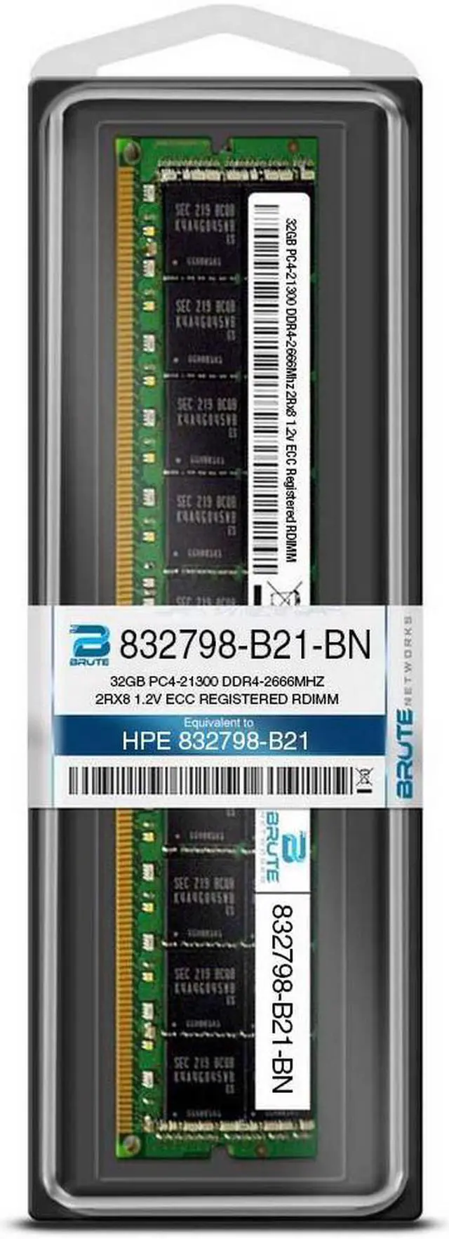 Brute Networks 832798-B21-BN is an OEM compatible 32GB PC4-21300 DDR4-2666Mhz 2Rx8 1.2v ECC Registered RDIMM , equivalent to HPE labeled PN#: 832798-B21