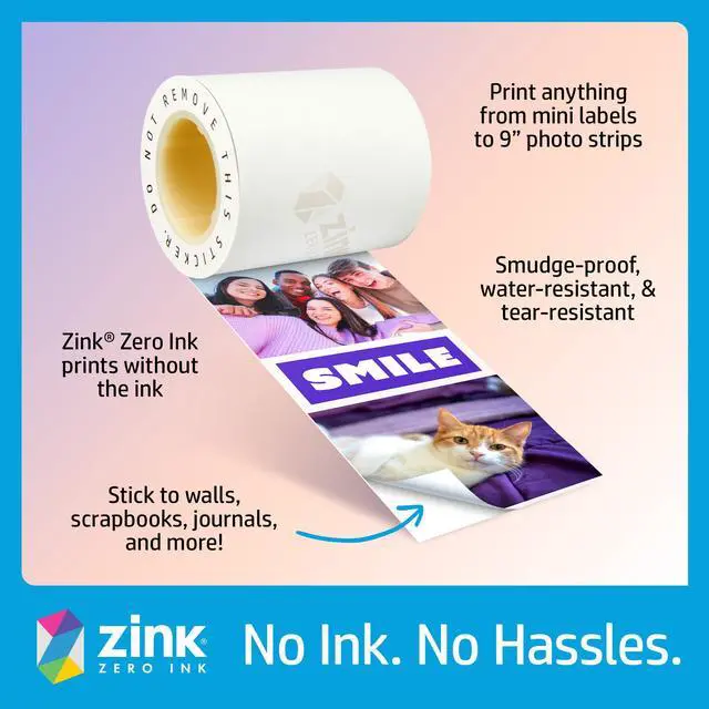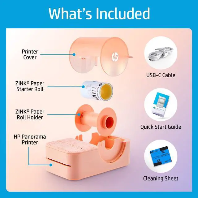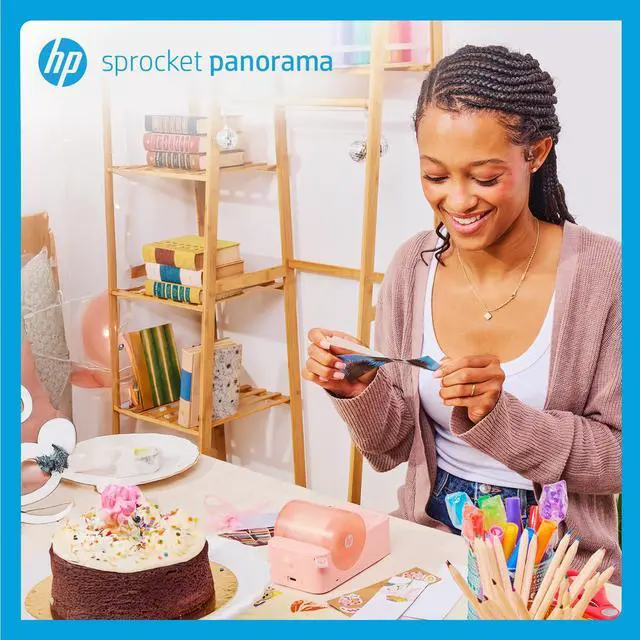 This HP portable printer lets you instantly print your favorite photo projects, labels, photobooth strips, and more, from 0.5” to 9” long on 2” wide sticky-backed paper! Take the mini photo printer anywhere for fun, on-the-go creativity. With the compatible HP Sprocket Photo Printer Panorama app, you can easily customize your creations with filters, and more before printing from your iOS or Android.
