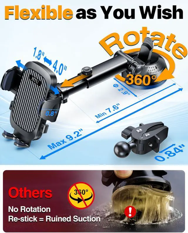 - Dashboard Compatibility: Suction cups work on flat, smooth dashboards. For other leather, waxed, or textured dashboards, use the windshield or air vent mount.