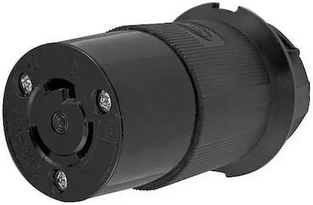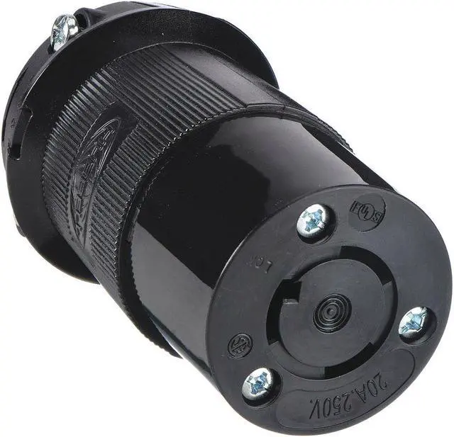 The HUBBELL 20A Locking Connector L6-20R is an industrial-grade connector rated for use in specified electrical applications. It features a black ribbed nylon housing constructed with a black ribbed nylon housing rated for impact and chemical resistance per manufacturer specifications, that provides both impact and chemical resistance, with an integral dust shield to protect the wiring chamber from contaminants. The connector accommodates cord sizes ranging from 0.360" to 0.930", and utilizes screw terminals for wire connection.