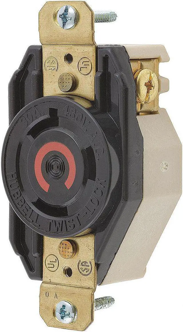 The HUBBELL 30A Twist-Lock Receptacle L8-30R is a locking receptacle rated for use in indoor, dry locations. It features a twist-lock mechanism intended to reduce the likelihood of accidental disconnection and supports single-phase, 480V AC circuits with a current rating of 30 amps. The device accommodates both back and side wiring with wire restraint recesses.