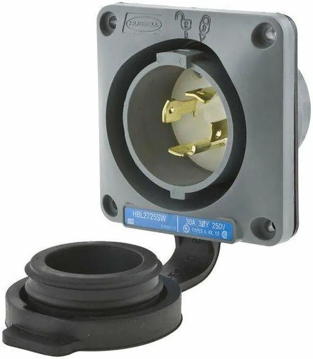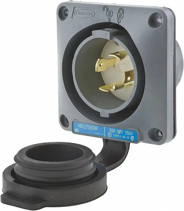Watertight Flanged Locking Inlet, Current Rating 30 A, Housing Color Gray, IP Rating IP66, Mount Type Flush, NEMA Enclosure Rating 12, 4, 4X, NEMA Plug Configuration L15-30P, Number of Blades 4, Number of Poles 3, Phase Three, Resistance Properties Impact Resistant, Watertight, Voltage Rating 250V AC, Wiring Style Standard, Flange Type Flanged, Grounding Grounded, Horsepower Rating 3 hp, Housing Material Thermoplastic, Includes Mounting Hardware Yes, Maximum Wire Size 8 AWG. This item has been restricted from sale in the following state (s): []