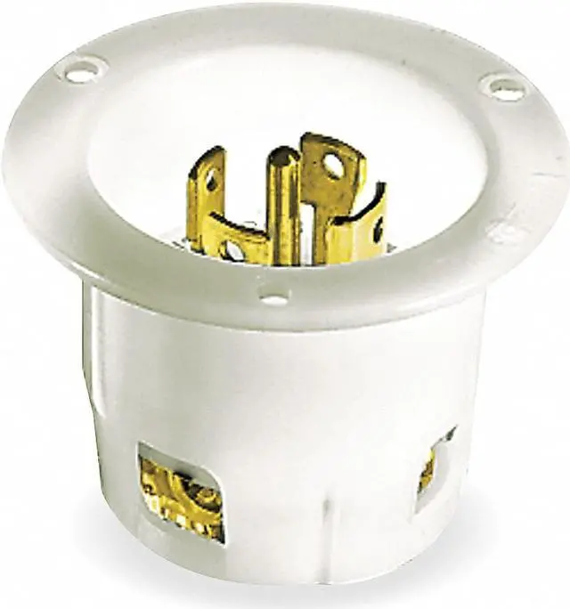 Flanged Locking Inlet, Current Rating 30 A, Flange Material Nylon, Housing Color White, IP Rating IP20, Mount Type Flush, NEMA Enclosure Rating 12, 4X, NEMA Plug Configuration L21-30P, Number of Blades 5, Number of Poles 4, Phase Three, Resistance Properties Impact Resistant, Moisture Resistant, Voltage Rating 120/208V AC, Wiring Style Standard, Face Diameter 2.23 in, Flange Diameter 3.06 in, Flange Type Flanged, Grounding Grounded, Horsepower Rating 3 hp, Housing Material Nylon. This item has been restricted from sale in the following state (s): []