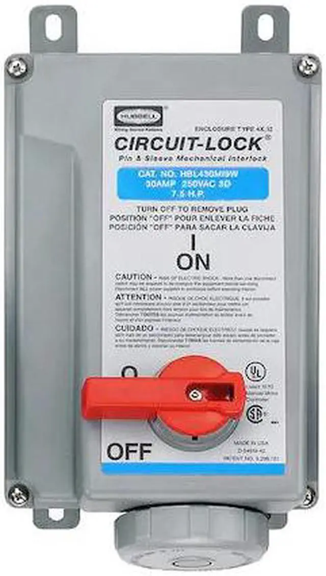 The HUBBELL Unfused Circuit-Lock® Watertight Mechanical Interlock is a pin and sleeve device rated for use with specified ampacity in environments requiring watertight electrical connections, suitable for indoor and outdoor applications. This unit integrates a disconnect switch with the receptacle, providing a means to visually verify disconnection when the plug is removed and locked out. The interlock mechanism restricts operation of the switch unless the plug is engaged, and restricts removal of the plug until the switch is off. It features a non-metallic thermoplastic housing; housing can be used with metallic conduit; consult installation instructions regarding grounding requirements, compatible with metallic conduit without affecting ground continuity, and supports IEC 60309-2 plugs.