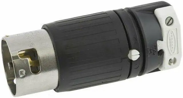 The HUBBELL 50A Twist-Lock Plug is a locking plug with twist-lock engagement intended for industrial electrical connections. It features a nylon housing and brass blades; intended for indoor use in dry locations. The plug accommodates cord sizes from 0.750 to 1.125 inches and supports wire sizes ranging from 8 AWG to 4 AWG, with screw terminal connections.