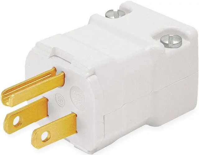 Straight Blade Plug, Connection Orientation Straight, Current Rating 15 A, Grounding Grounded, Horsepower Rating 1/2 hp, Housing Color White, IP Rating IP20, NEMA Plug Configuration 5-15P, Number of Blades 3, Number of Poles 2, Phase Single, Polarized Yes, Resistance Properties Corrosion Resistant, UL 94 Flammability Rating HB, Voltage Rating 125V AC, Wire Connection Type Screw Terminals, Wiring Style Hinged, For Maximum Cable Diameter 0.66 in, For Minimum Cable Diameter 0.3 in. This item has been restricted from sale in the following state (s): []
