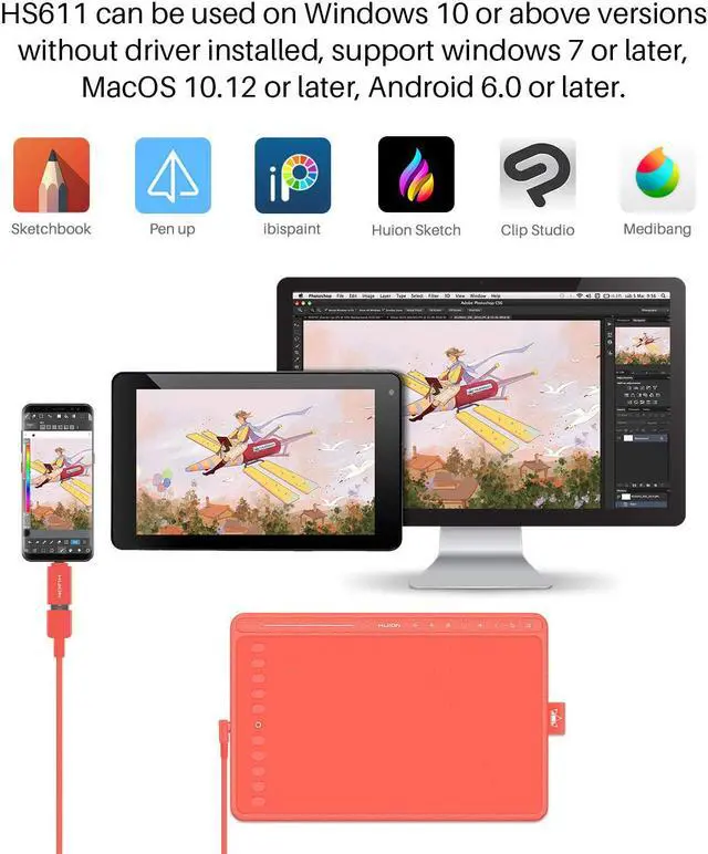 For the professional artist, new designer and amateur hobbyist, Huion drawing tablets Compatible with Windows 7 or above /Mac OS 10.12 or above/ Android 6.0 or above, as well support most of the drawing software such as PS, SAI, CorelPainter, Illustrator, SketchBook Pro, Manga Studio, Krita and more. The advanced pen technology offer better and precise control of drawing lines in digital drawing and photo-editing.