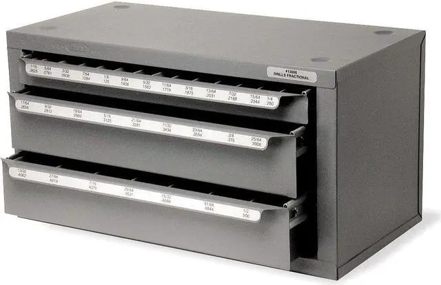 Drill Bit Cabinet, Jobber Length, Holds 1/16 to 1/2 In Fractions by 64ths, Steel, Overall Case Width 10 1/4 In, Overall Case Depth 9 21/32 In, Overall Case Height 10 1/32 In, Number of Compartments 29, Number of Drawers 3, Drill Bits Not Included. This item has been restricted from sale in the following state (s): []