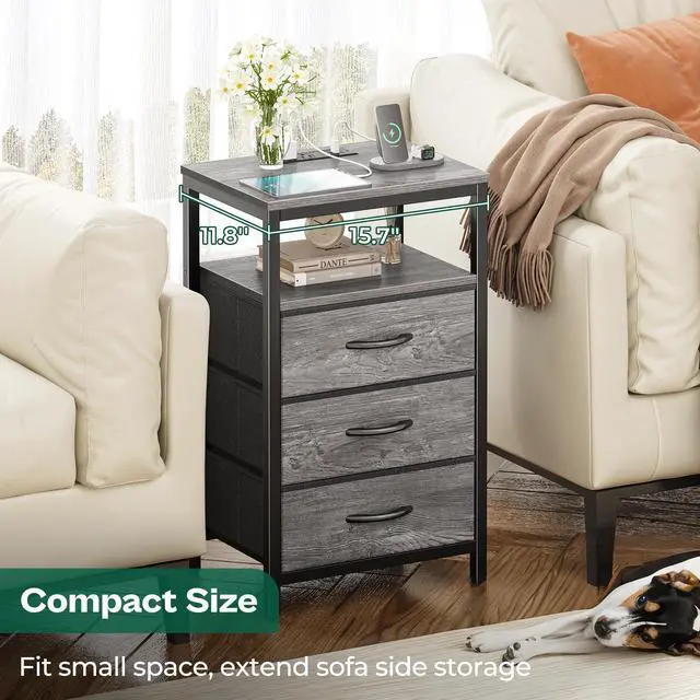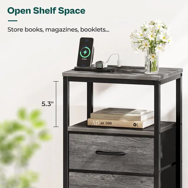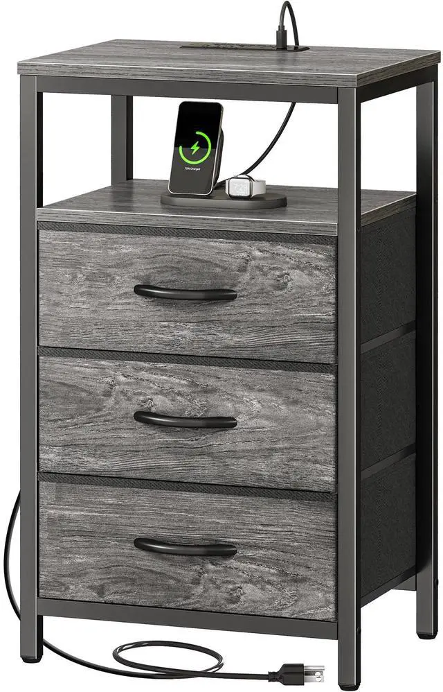Enjoy a clutter-free bedside space with our charging nightstand. 3 fabric drawers store your bedside and sofa side items well and protect your privacy. Powder-coated metal frame and durable particle board ensure a robust structure.