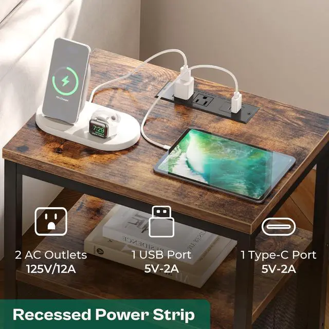 Enjoy a clutter-free bedside space with our charging nightstand. 2 fabric drawers store your bedside and sofa side items well and protect your privacy. Powder-coated metal frame and durable particle board ensure a robust structure.
