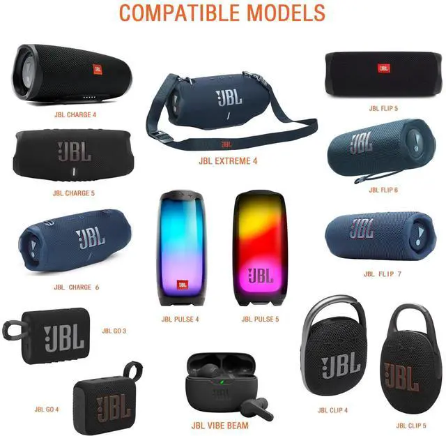 JBL Charge 4, JBL Charge 5, JBL Charge 6, JBL Flip 5, JBL Flip 6, JBL Flip 7, JBL Pulse 4, JBL Pulse 5, JBL GO 3, JBL GO 4, JBL CLIP 4, JBL CLIP 5, JBL EXTREME 4, JBL VIBE BEAM.