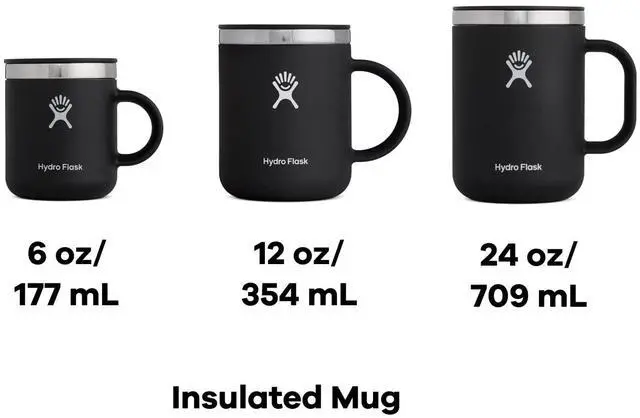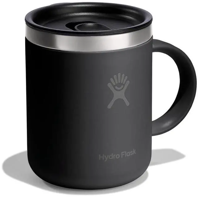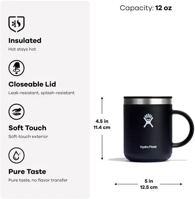 12 OZ TONAL BLACK INSULATED MUG: The Hydro Flask stainless steel insulated mug keeps drinks hot for hours. Sized for the perfect cup with a closeable, leak-resistant and splash-resistant lid.