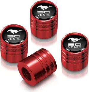 Ford Mustang 50 Years Black on Red Aluminum Cylinder-Style Tire Valve Stem Caps