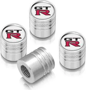 Nissan GT-R White on Silver Aluminum Cylinder-Style Tire Valve Stem Caps