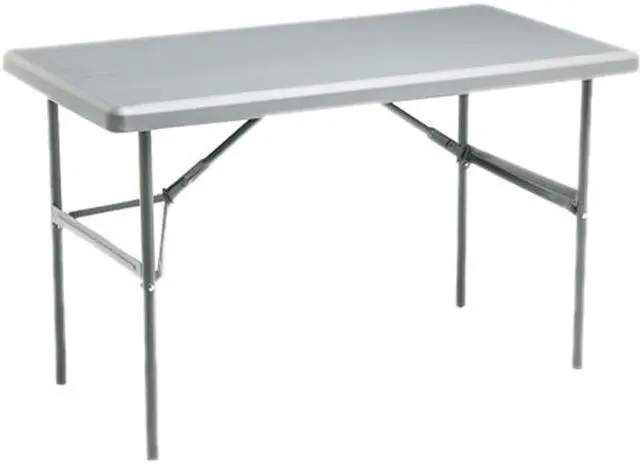 Folding table is made for heavy-duty use indoors or outdoors yet is 30 percent lighter than standard folding tables. Sturdy construction holds 300 lb. evenly distributed. 2 tabletop is made of durable, blow-molded, high-density polyethylene that is dent-resistant and scratch-resistant. 1 tubular legs are made of heavy-gauge steel with a powder-coat finish. Straight legs fold into recessed cavities beneath the table. Folding table is designed to nest with other Iceberg IndestrucTable Too tables when stacking to allow maximum storage capacity. Application/Usage: Outdoor Application/Usage: Indoor Material: Steel Application/Usage: Outdoor Application/Usage: Indoor Material: Steel Product Type: Folding Table Product Type: Folding Table Dimensions: 29 Height Manufacturer Part Number: 65207 Packaged Quantity: 1 Each Limited Warranty: 15 Year Features: Stackable Features: Scratch Resistant Features: Lightweight Features: Heavy Duty Features: Dent Resistant Features: Durable Manufacturer: Iceberg Enterprises, LLC Product Name: IndestrucTable TOO 1200 Series Folding Table Product Line: IndestrucTable TOO Maximum Load Capacity: 300 lb Brand Name: Iceberg Maximum Load Capacity: 300 lb Brand Name: Iceberg Height: 29 Country of Origin: United States Assembly Required: Yes Table Top Shape: Rectangle Base Included: Yes Base Style: Straight Edge Style: Beveled Table Top Width: 48 Table Top Length: 24 Product Family: IndestrucTable TOO Table Top Thickness: 1 Color/Finish: Powder Coated Color/Finish: Charcoal Gray Table Top Shape: Rectangle Base Included: Yes Base Style: Straight Edge Style: Beveled Table Top Width: 48 Table Top Length: 24 Table Top Thickness: 1 Color/Finish: Powder Coated Color/Finish: Charcoal Gray Top Material: Polyethylene