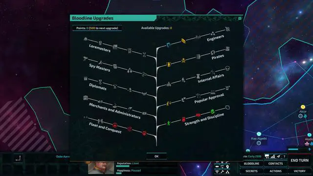 As more of your kin rise to power, you will be able to unlock points that can be spent on upgrades to benefit generations to come. Garner a bloodthirsty reputation that intimidates other rulers, win the adoration of the common folk, or become the galaxy’s foremost diplomats. Choose your legacy!