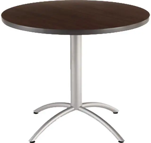 Table Top Thickness:1.13" Table Top Diameter:36" Table Top Shape:Round Base Included:Yes Edge Style:T-mold Finishing: Powder Coated - Base Melamine - Top Features: Adjustable Feet Moisture Resistant Wear Resistant Color: Walnut Base Material: Vinyl Edge Particleboard Top Steel Base