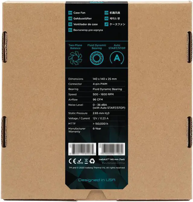 Iceberg Thermal IceGALE fans are designed to transport airflow in an aerodynamic way, delivering a concentrated airflow that helps to generate higher PC performance and efficiency. Our fans provide a more powerful airflow, allowing the temperature inside your case to stay cooler, expanding the longevity of your PCs components. All IceGALE fans have been Two-Plane balanced to ensure stability. Anti-vibration pads are attached to the outer corners of the fans frame to absorb and eliminate vibration. Our IceGALE 140mm fan is made with a Rigid Brass Housing to provide a reliable product, and a Fluid Dynamic Bearing helping to reduce noise levels, ensuring quiet operation.