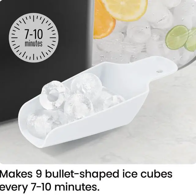 ICE IN MINUTES: This countertop ice maker produces 9 pieces of round ice in 7 minutes! That's faster than your fridge and ensures youll never run out of ice mid-party again.