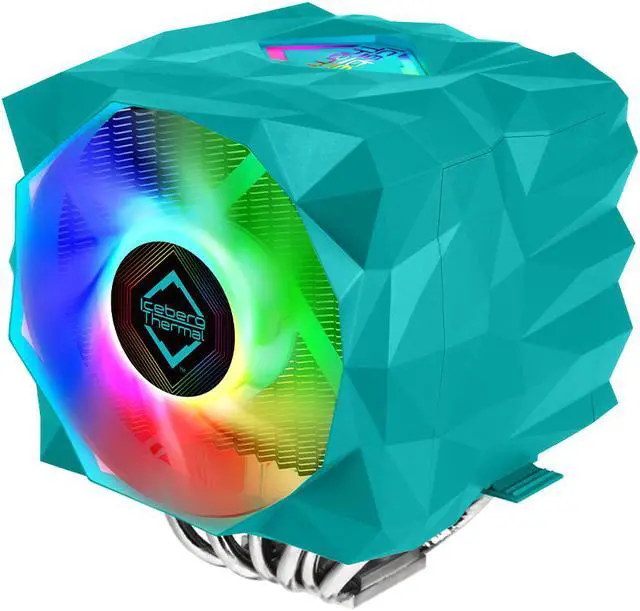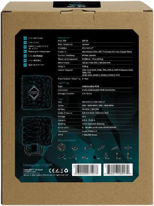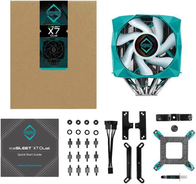 Iceberg Thermal IceSLEET X7 Dual ARGB dual fan CPU cooler compatible with Intel & AMD. Complete bond soldering between fin sheets, not a stacked fin array. Soldering bond creates an optimum utilization of the cooler tower for rapid heat dissipation. Pipe architecture design with wide sweeping curves to increase performance, allowing the user to overclock. Copper base fully covers the chipset. Mechanical automatic Start/Stop function creates a quiet work/play environment and reduces power consumption decreasing heat to create a more comfortable work/play experience. When the fan is in off mode it goes silent, until the PWM duty cycle reaches 21% loading.