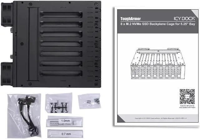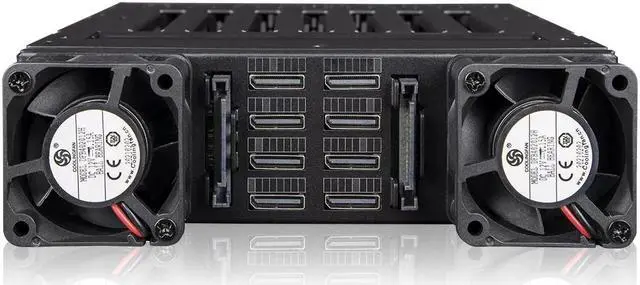 | Features | Supports 8 x PCIe M.2 NVMe SSDs of all lengths - 30mm (2230), 42mm (2242), 60mm (2260), 80mm (2280), and 110mm (22110) Installs into 1 x standard external 5.25" optical drive bay Uses 8 x OCuLink (SFF - 8612) to connect, pin-out defined by SFF - 9402 Rev 1.1 Supports PCIe 4.0 specifications with transfer rates up to 64Gbps per drive bay Powers 8 x M.2 SSDs through 2 x 15 - pin SATA power connectors Ruggedized full - metal enclosure meeting flammability requirements Equipped with high-performance dual 40 x 20mm cooling fans Removable drive tray with tool - less drive installation for easy drive maintenance Huge heatsink trays with thermal pads included dispersing heat from the drive Anti-Vibration Technology - Creates a safe environment for SSDs Active Power Technology - Saves power by shutting off the enclosure when no drive is installed EMI Grounding - Protects SSDs from electrical damage Drive ID plugs are included to keep track of your drives The Eagle - hook tray latch securely holds the tray inside the enclosure Supports SATA power cables with locking latch design 2 x SATA 15pin power extension cable are included |