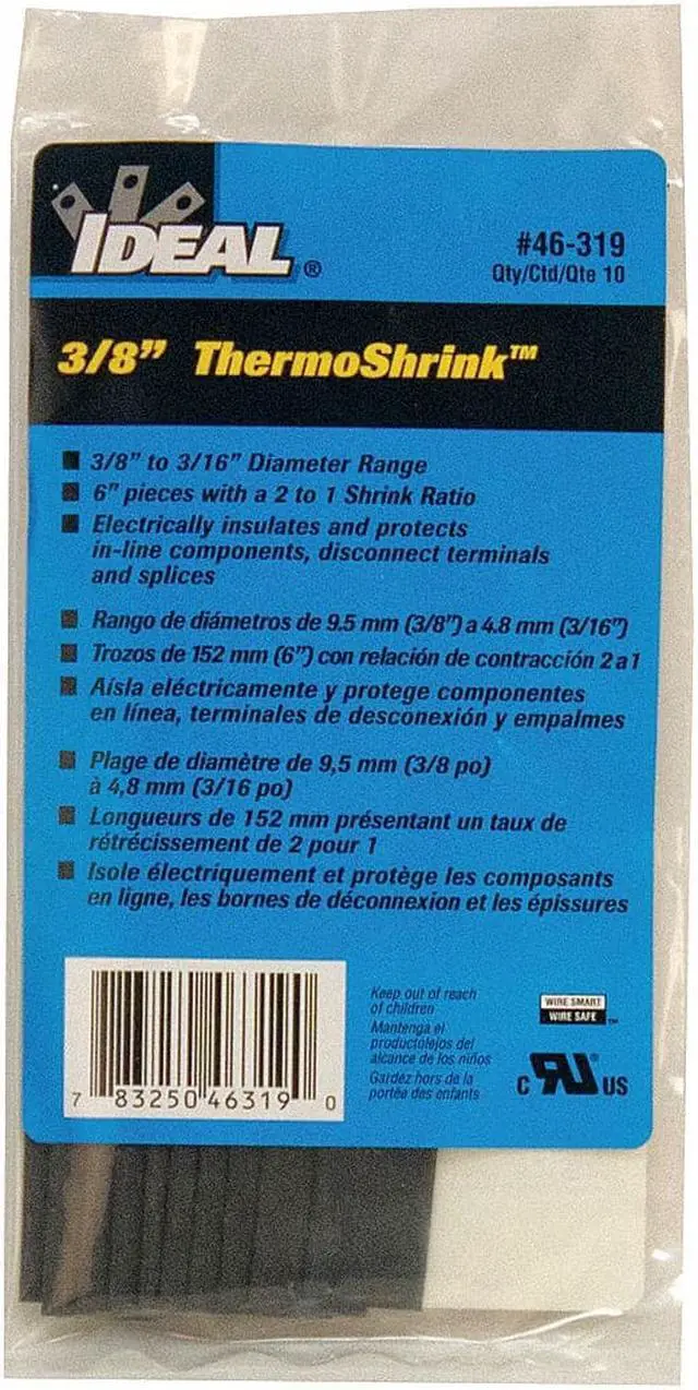Heat Shrink Tubing, Thin Wall, Material Polyolefin, Flexible, Flame Retardant Yes, Adhesive Lined No, Shrink Ratio 2:1, Use With Wire Size 8 AWG to 4 AWG, I. D. Before Shrinking 0.42 in, I. D. After Shrinking 0.19 in, Wall Thickness After Shrinking 0.02 in, Length 6 in, Shrink Tubing Properties UV Light-Resistant, Color Black, Temp. Range -55 Degrees to 125 Degrees F, Package Style Individual Pieces, Min. Shrink Temp. 158 Degrees F, Dielectric Strength 600 V, Max.