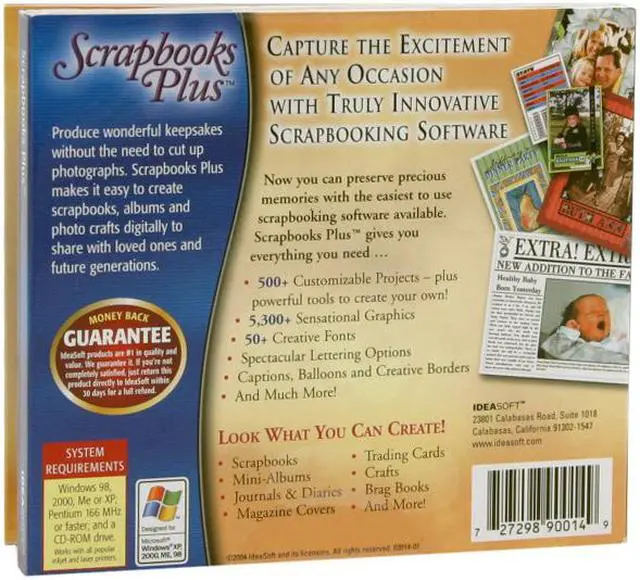 | Feature | Have you been thinking about creating albums for all those great photos, but you don't know where to begin? Scrapbooks Plus makes it easy to create albums to share with family and friends. Whether you're looking to scan old photos or make use of the scores of great digital photos already on your hard drive, Scrapbooks Plus has all of the tools and professionally designed templates you need to capture the excitement of any occasion or event. 500+ Scrapbook Templates and Customizable Projects 5,300+ Sensational Graphics Spectacular Special Effects Captions, Balloons and Creative Borders Facing Pages Spectacular Custom Lettering Powerful Drawing Tools And Much More! |