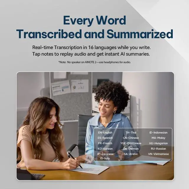 16-Language Transcription Support:AINOTE 2 supports multi-language transcription designed for meetings, lectures, and interviews. This feature helps capture spoken content and convert it into text for easier review and organization. Requires an active internet connection for transcription services. Accuracy depends on audio quality, speaker accent, and environment. Designed to assist note review, not for word-for-word professional transcription.