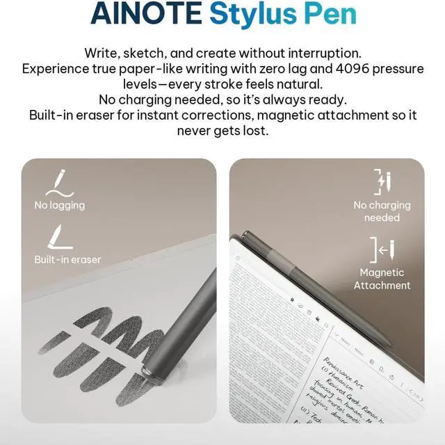 Complete Package Inside the Box The package includes the AINOTE 2 tablet, stylus pen, USB cable, and user manualproviding everything needed to start using your e-ink tablet right out of the box. Protective case is not included and sold separately.