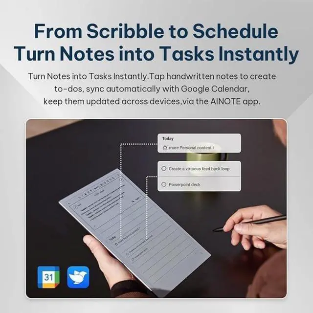 Seamless Google Calendar Sync : Effortlessly connect AINOTE 2 with Google Calendar to keep schedules updated across devices. More app integrations coming soon, so you stay productive without switching tools.