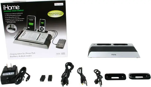 | Features | Dual universal iPod/iPhone docks: One to charge and sync to iTunes Second dock for quick charge of iPhone/iPod Charges (via USB port) Blackberry, and most eBook readers, including Sony Reader, Amazon Kindle, Barnes & Noble Nook, etc. Expandable, rubberized rest area accommodates Blackberry, and most eBook readers Integrated cable management |