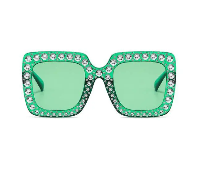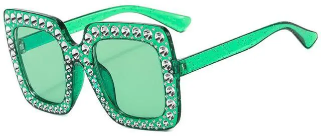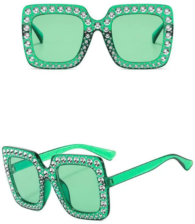 Oversized Crystal Sunglasses for Women Square Thick Frame Bling Rhinestone Sparkling Glasses (Green)