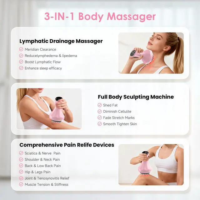 Unlike others,this device combines multi-needle massage, Soothing Bio-Pulse, heat, vibraion, targets Cellulite, stretch marks, sweling, bloating?, Lymphedema, Lipedema and body culpting.
