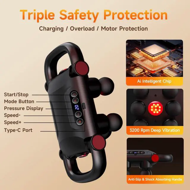 • [Safety Protection]With charging protection and overload protection, our massager prioritizes safety during use. It is also designed with ergonomics in mind, reducing hand fatigue and ensuring comfort even with extended use.