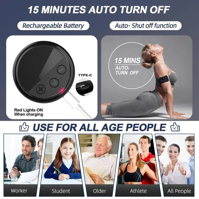 15 Minute Auto-off : The electric muscle stimulator will atuo-off after 15min automatically if there is no further operate. Safe and preventing overtreatment. It is small size and lightweight,easy to carry. Suitable for you to enjoy massage anywhere and anytime